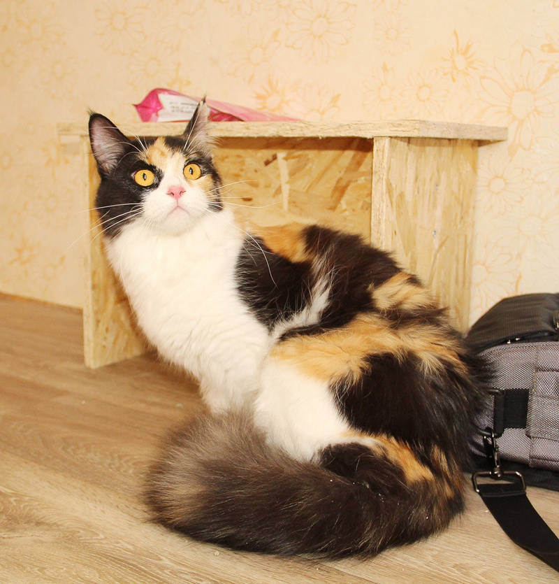 Майра общительная, ласкучая кошка. Любопытная очень! Если увидит сумку, проверит, что там, любую новую вещь изучит, потрогает лапкой.