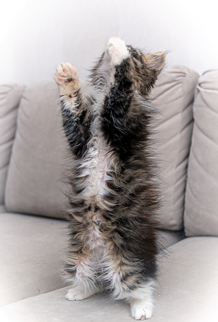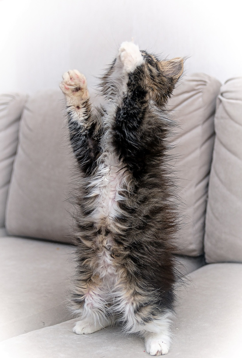 Не смотря на рождение в экстремально диких условиях – подвал, процесс адаптации к домашней жизни пройден с успехом, получен красный диплом «домашнего кота»: