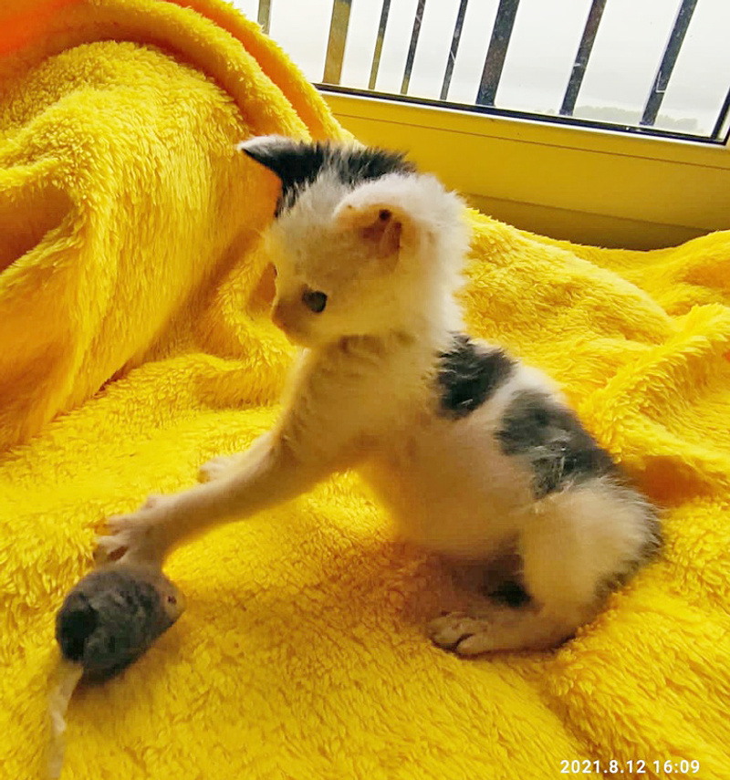 Но малыш не унывает: играет, бегает, хорошо кушает. Вот только пока никак не может научиться умываться, ведь этому котят учит мама, а мама пока далеко.