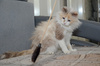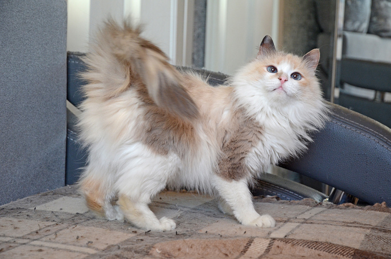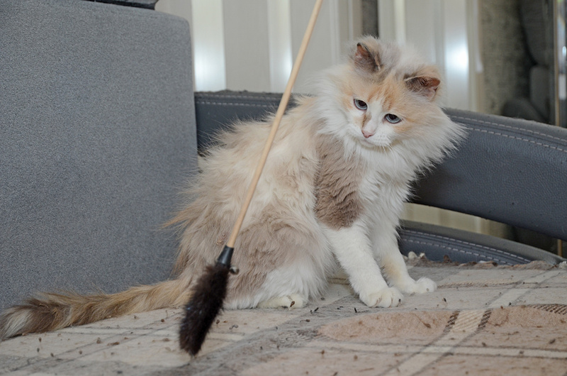 Обожает играть с махалочками и мячиками, к другим кошкам относится спокойно.