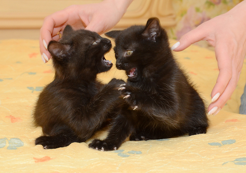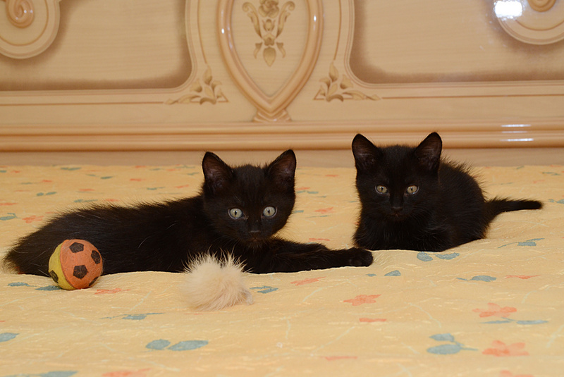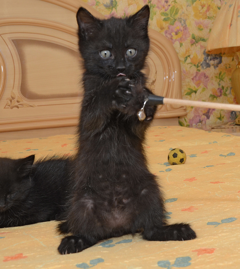 Малыш-черныш Уголёк и малышка-чернышка Смородинка, которые уже научились метко пользоваться лоточком, лазать по когтеточке, кушать самостоятельно и играть-играть-играть!