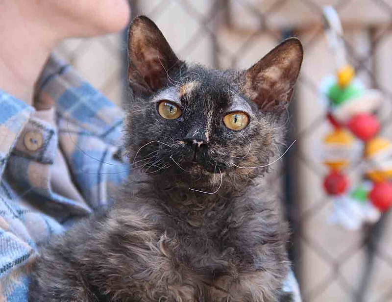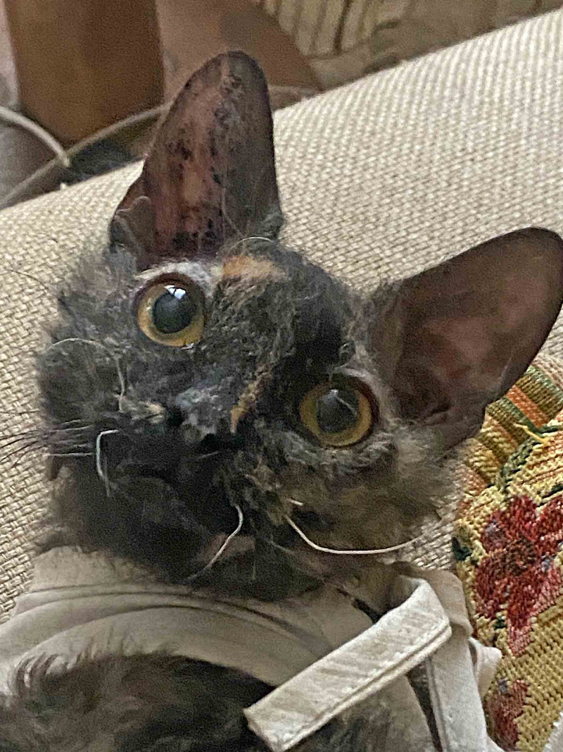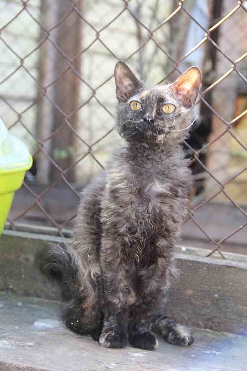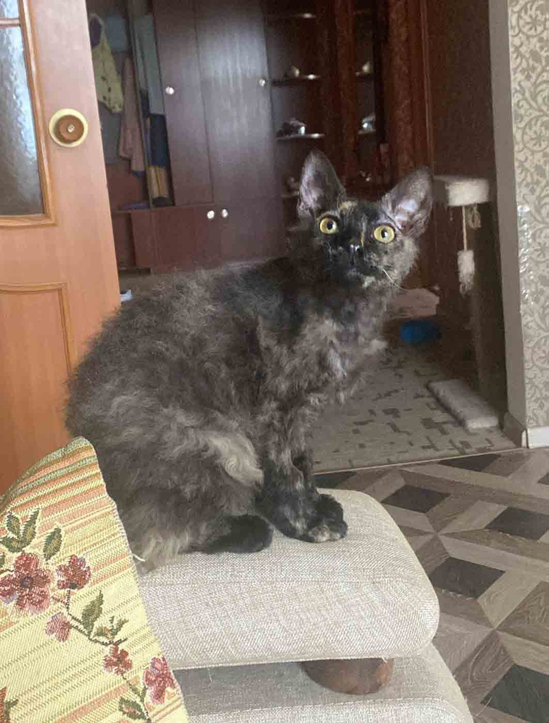 Я бы назвала её Кудряшкой Сью, потому что у неё очень смешная внешность: мордочка сфинкса, а шубка короткая и кудрявая, наверно, это помесь сфинкса браш.