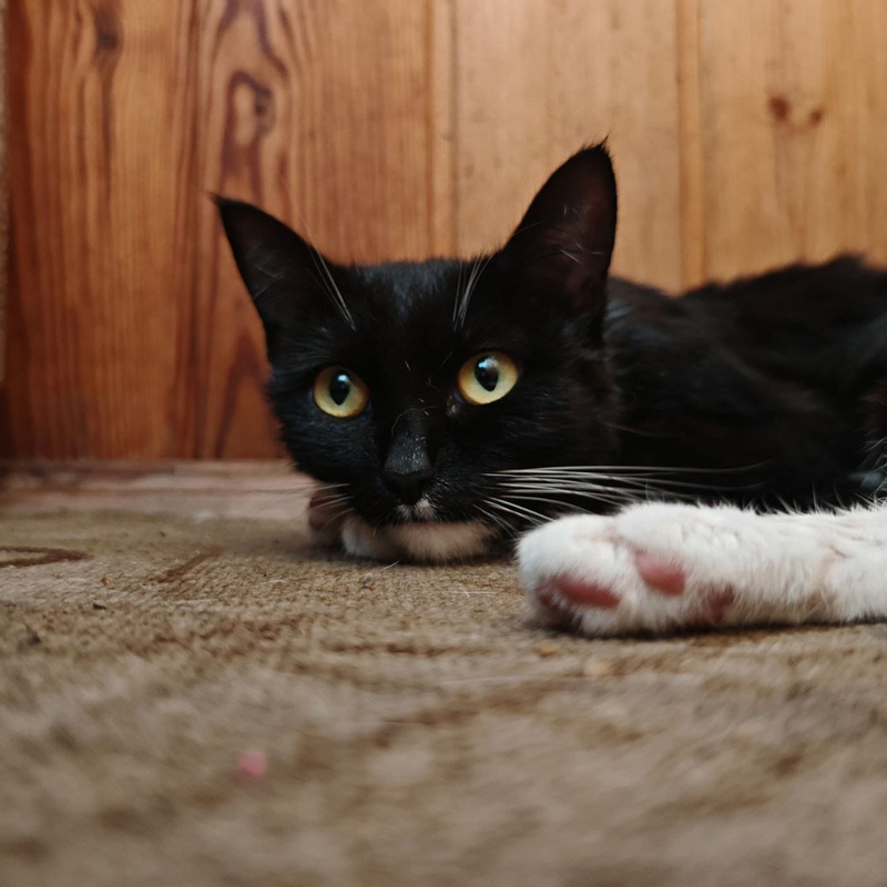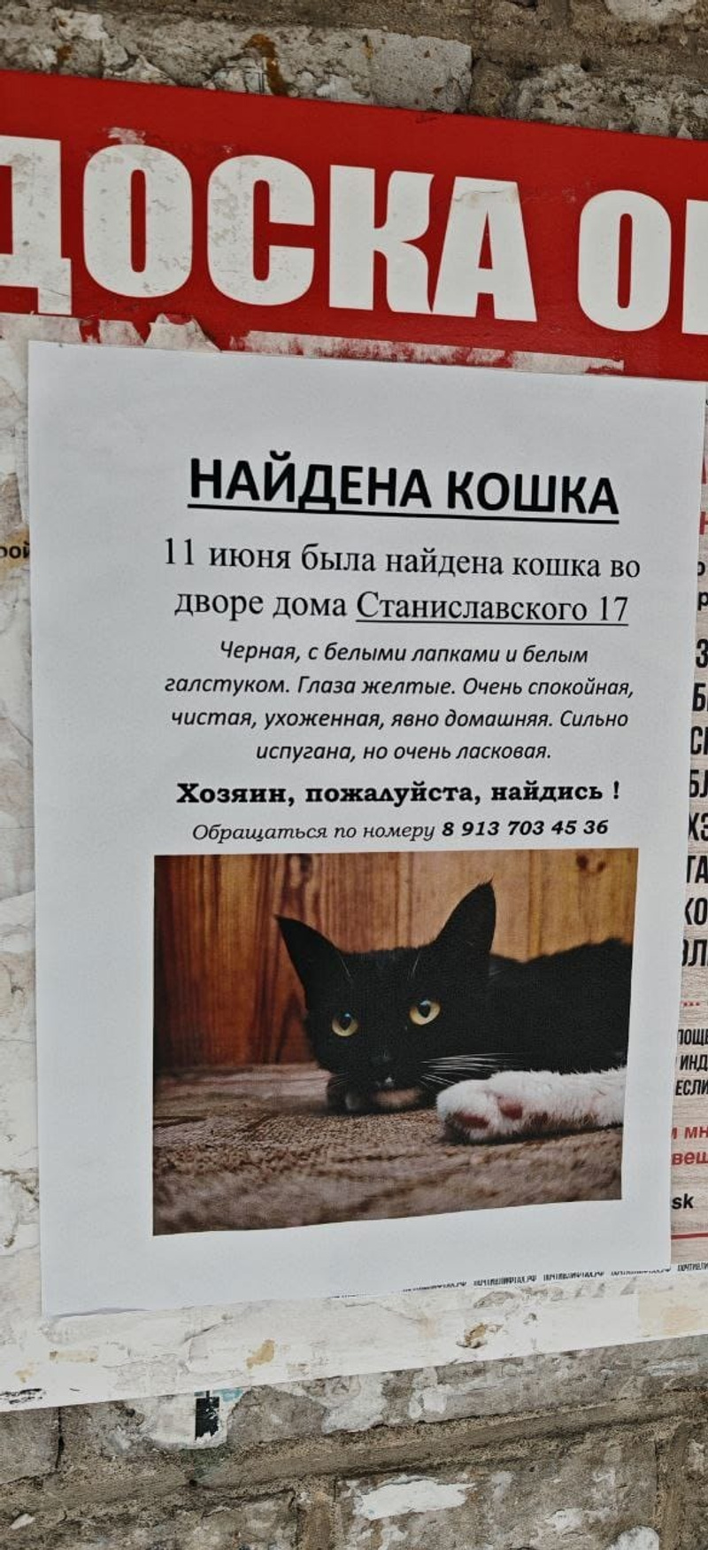 11 июня к служебному входу "Вилка Ложка " на Станиславского 17 прибилась молоденькая кошечка . Сотрудники попросили девушку , живущую в этом доме , временно приютить у себя. В тот же день кошку помыли , свозили в "Энималз" ,кошка осмотрена ветеринаром , 2,4 года ,здорова . Ест , пьет , ходит в лоток . Срочный пристрой - т к сьемная квартира . Обьявления по округе развешаны , результат - отрицательный.