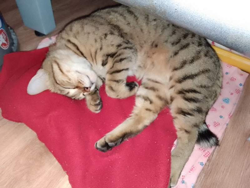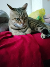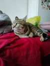 4 года, лоток хорошо знает, ласковая, но в стрессе, мяучит по ночам, нужно время на адаптацию, на других кошачьих шипит.
