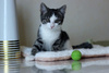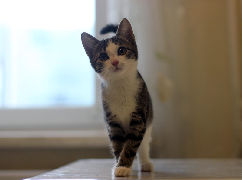 Очаровательная котёнок-девочка ищет добрые руки. Полосатая с белой грудкой. возраст 2,5 мес. Приучена к лотку, игривая и ласковая малышка