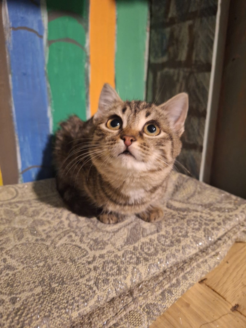 Эту милую малышку нашли на трассе. Сейчас котёнок временно проживает в приюте, в клеточке.