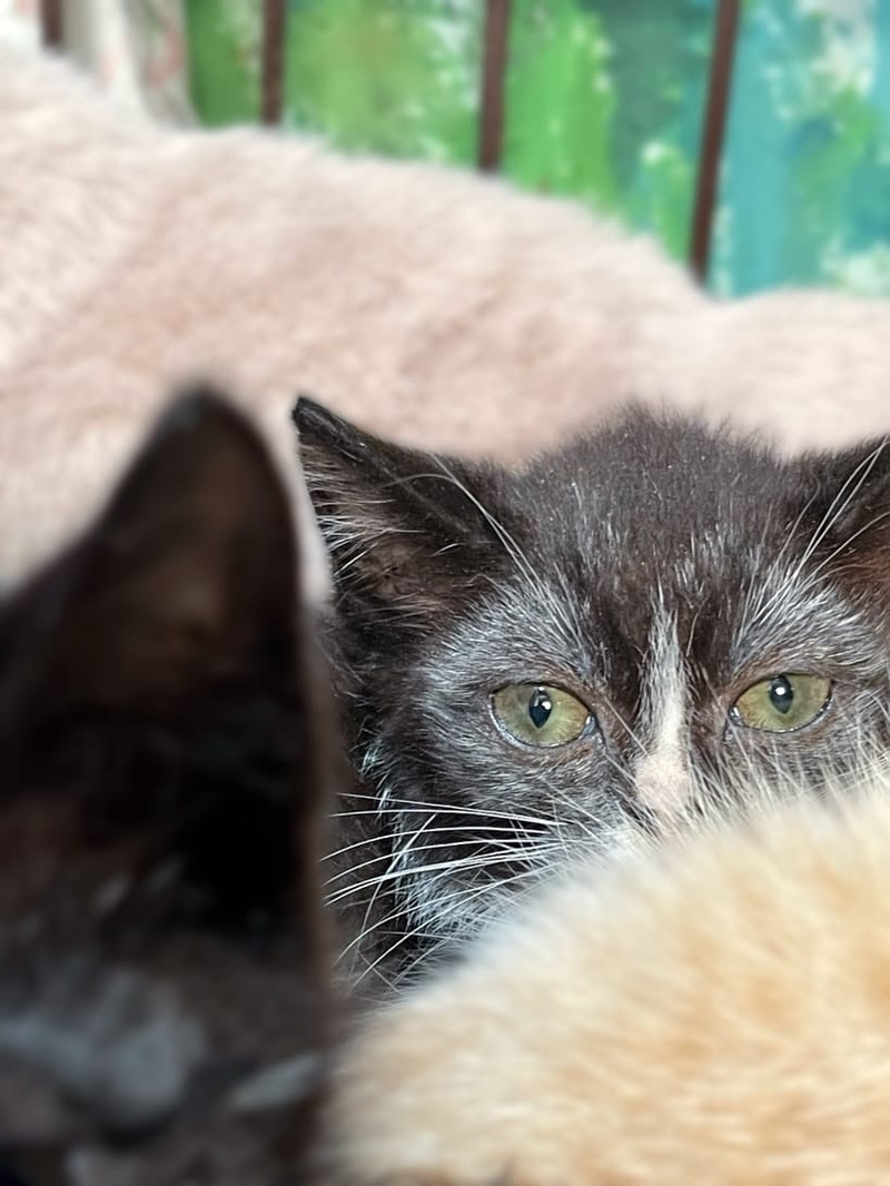 На фото у них испуганные мордашки, потому что они не ждали, что кто-то направит на них вспышку фотоаппарата. А без вспышки их не сфотографировать, дети живёт в тёмной комнатке, в клетке. Приют переполнен и другого места для малышей нет. Зато тепло и безопасно.