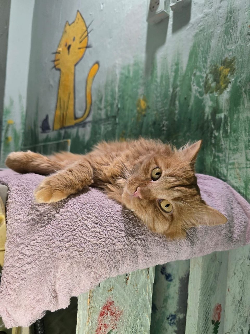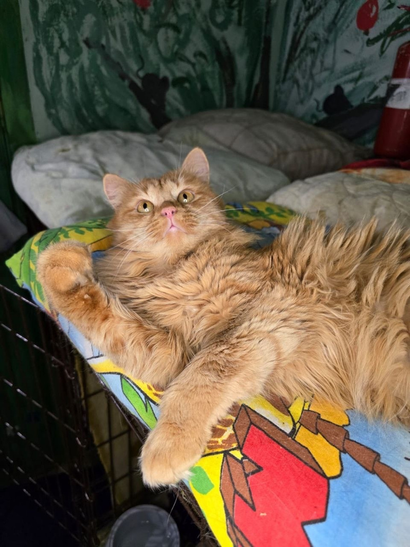 Вулкана подбросили на территорию приюта, сейчас он живёт в клеточке, так как приют переполнен, нет возможности каждому котику предоставить диван. Невероятно ласковый, дружелюбный, контактный парень. А ещё Вулкан очень любит поговорить)))